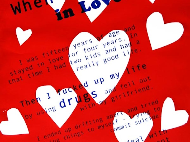 A project exploring and expressing the views of young male sex workers in the Canal Street area of Manchester. The works were created as part of an exhibition 'Looking from the other side of the street" - displayed on car park railings. The following are screen prints and images produced by the young men after visits to Hot Bed Press. Most of the artwork was produced in a mobile tent or in a hairdressers 'after hours'. To see full details of this exhibition click here The Blue Room