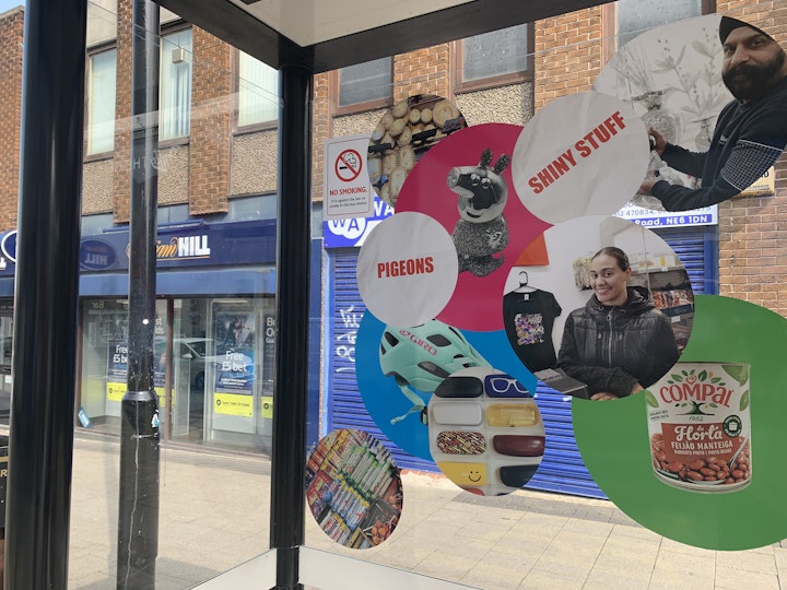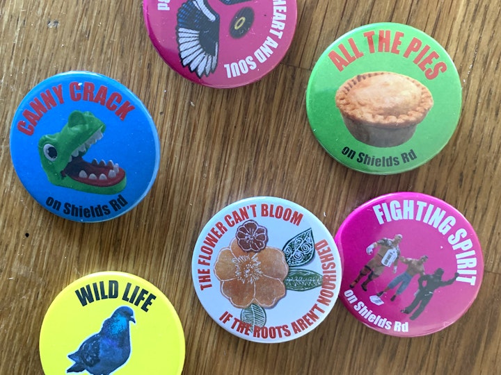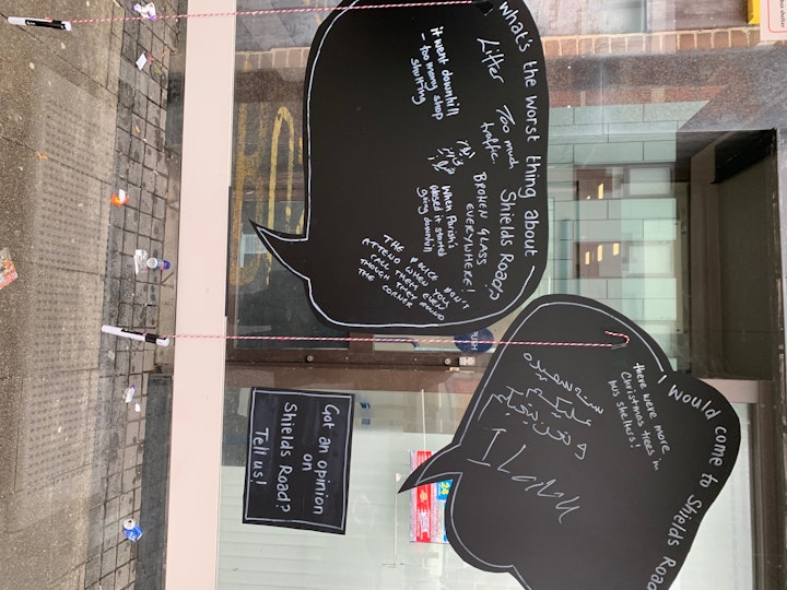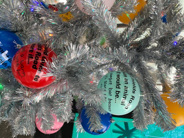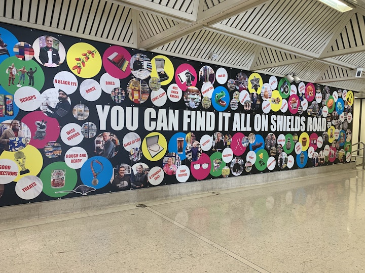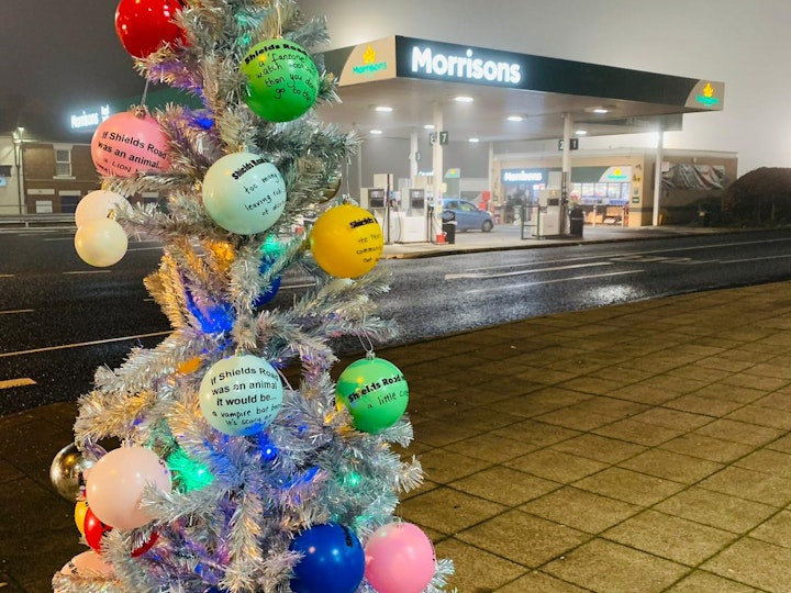We photographed shop owners and products that they sold, to feature on a giant mural for Byker Metro. We also installed several installations in Bus shelters, worked with 4 local mural artists to brighten up the shutters of the old much loved and now neglected Parish building, and toured a small Christmas tree for a night out to gather peoples thoughts and opinions on baubles.
